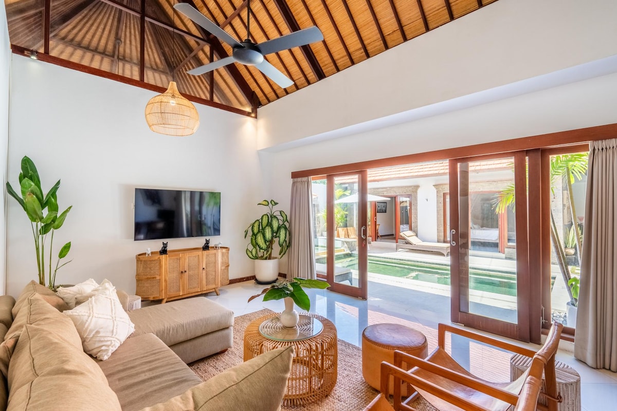 This villa offers an open living room, a fully equipped kitchen, and a cozy dining area. It features two comfy bedrooms with private bathrooms and an extra guest toilet. Relax by the sunny pool with inviting sunbeds for the perfect holiday vibe. Located just a 10-minute drive from Seminyak, Canggu, and beautiful beaches. Enjoy free cleaning service, fast Wi-Fi, a Smart TV, and a secure environment, ensuring a relaxing and unforgettable stay on the Island of the Gods.