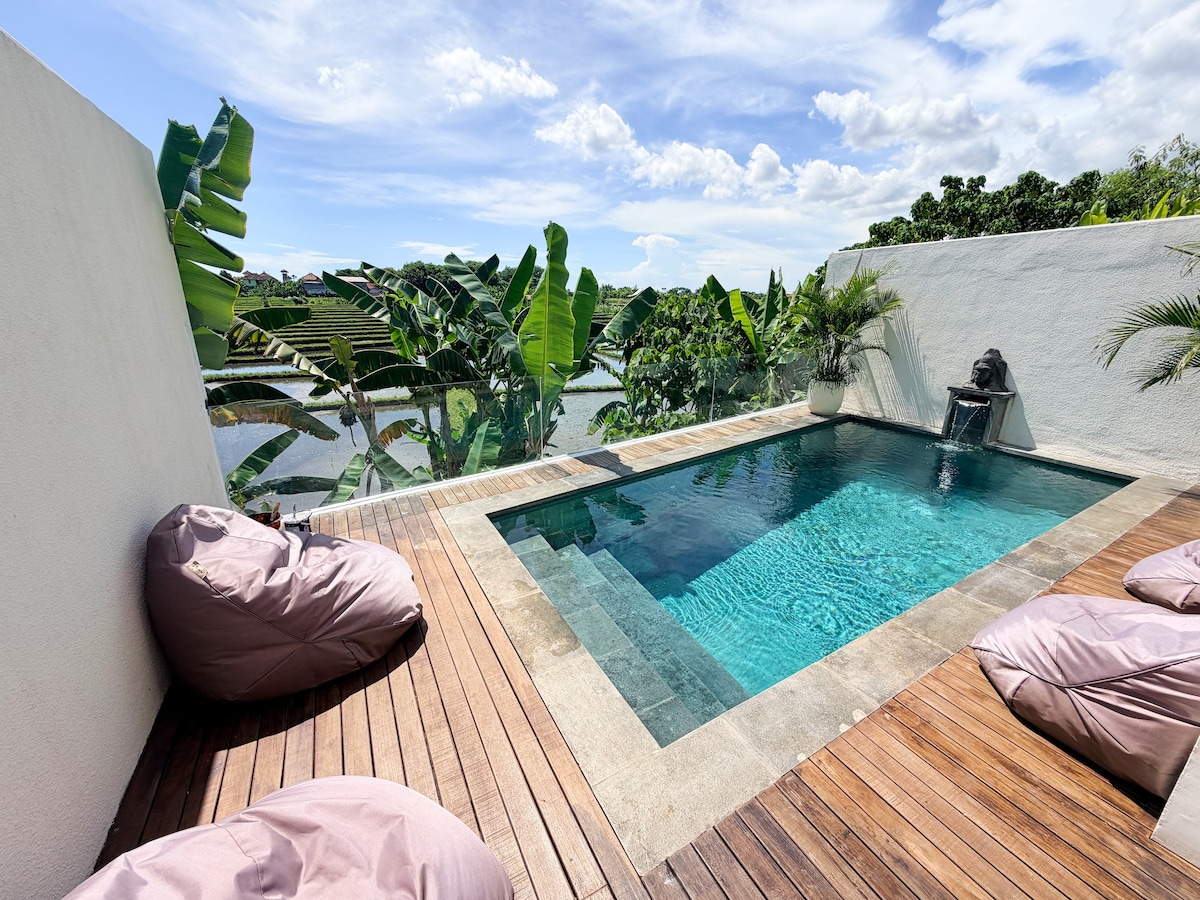 Beautiful brand new modern 3 bedrooms villa en-suite bathrooms with private swimming pool, full rice field view and garden located centrally between Canggu and Seminyak on a quiet side street away from the noise. This is a great location to explore Bali from as you are very central. 10 minutes from Canggu, 10 mins from Seminyak, 50 mins from Uluwatu, 50 mins from Ubud and 30 mins from the airport. Fully equipped kitchen, AC and smart TV in every room a great choice