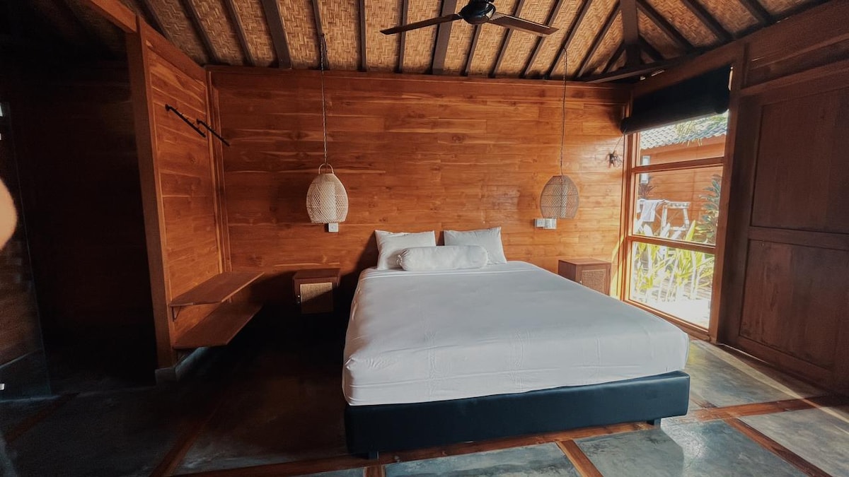 In the beautiful country of Uluwatu 1.2 Km to Padang Padang beach, our property seats in 2.000 m2 land, silently tucked into the forest, regardless of the Uluwatu building explosion. Just walking distance to "Ulu Island Padel" best surfing beaches, restaurants and amenities of the area This72 m/2 bungalow is equipped with 2X2 m bed, working desk, Starlink internet connection, a walk-in wardrobe, on-suite bathroom, a full equipped kitchen on a terrace facing the gardens, Smart TV, FAN, AC