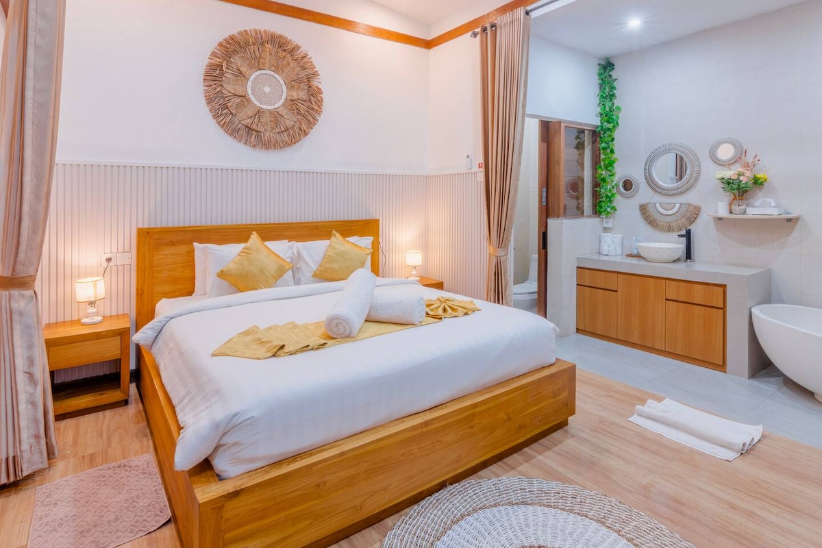 Enjoy your romantic private times in a luxurious complex, close to a fine selection of world-class cafes, restaurants and beach clubs. But perfectly hidden in a serene and quiet villa neighbourhood. This villa features an ensuite bathtub and offers a perfect dip-in pool. Enjoy your floating breakfast under the wood panels with sunlight gently pouring through. Chillax on the bean bag or sun loungers at your choice while soaking up the view of the garden.