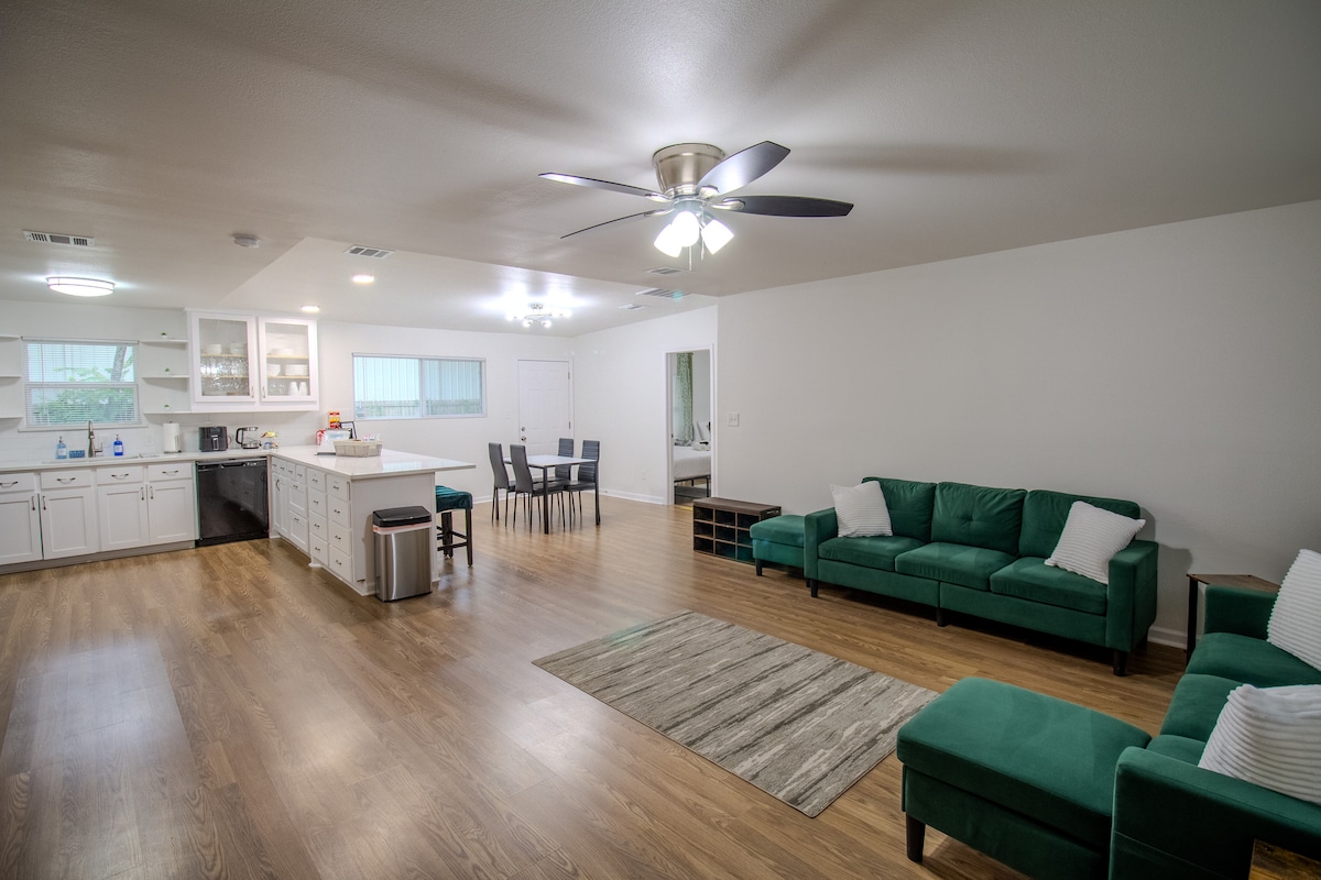 Excellent space in the heart of Denton. Flexible floorplan will a stylish funky flair. 3 bedrooms walking distance to the square and TWU. This home features 2 bedrooms with 1 queen bed per room and an additional bedroom that doubles as a bedroom/desk area/small dining area that features a twin bed. You will love this very versatile and stylish space that is your perfect home base to explore all that Denton has to offer.