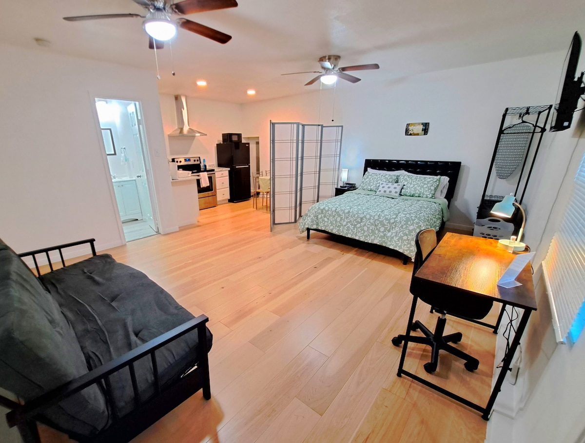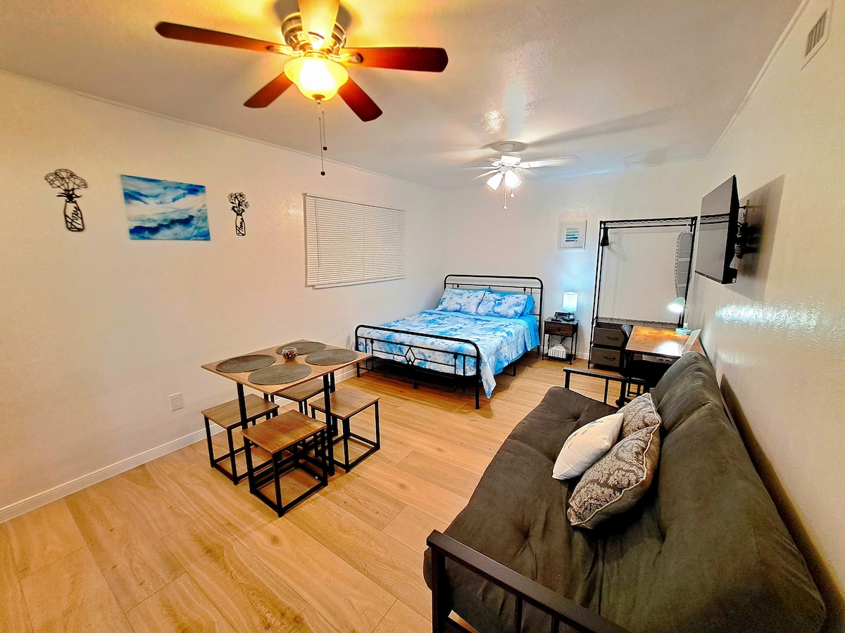 Private main door entrance, “not shared bathroom” comfortable 1-bedroom, 1-bath front side of the home, 2nd room will be 🔒 during your stay. This space is under the same roof, separated from the Host side by locked French doors covered with curtains for guests privacy Host will be using the back alley / garage entry during your stay • One Bedroom, Full size bed • Mini Kitchen * Self check in • 1 Bathroom • Street parking • Mini split * Community Pool * no access to laundry room or Patio.