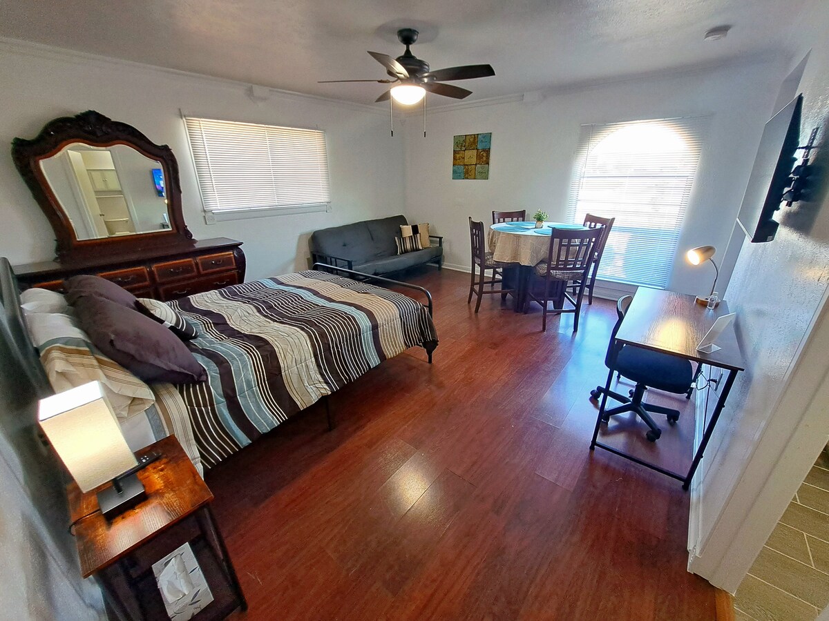 Newly constructed Guest Studio Apt, in a very friendly and quiet city of N. Dallas. It has a fully equipt kitchen with new appliances. A full new modern bathroom w/clean towels & toiletries. In-suite W&D. Also included an A/C -heater unit to keep your place fresh and/or cozy. Waterproof laminated floor, new wooden cabinets. In the bedroom a Full size bed and Roku TV, and a Full size Futton for seating or as an extra bed in the living room area. You will have the entire place for your self!