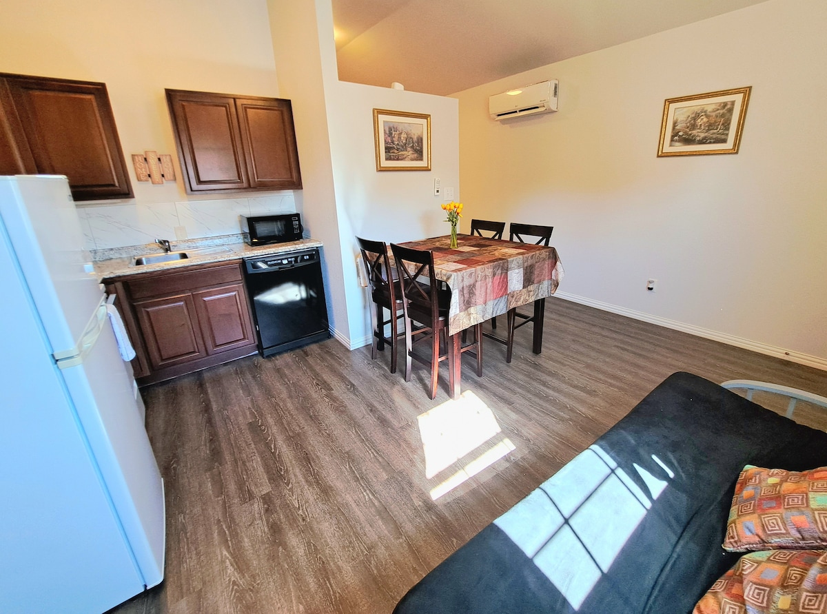Enjoy a private 2BR suite with no stairs and its own entrance in a quiet residential neighborhood. Relax in a cozy living area with fast Wi-Fi, Smart TVs in every room, a workspace, and a four-person table. The kitchenette has a microwave, fridge/freezer, sink, and basic dishes but no stove or oven. Enjoy complimentary coffee and a spotless, comfortable stay with great value.