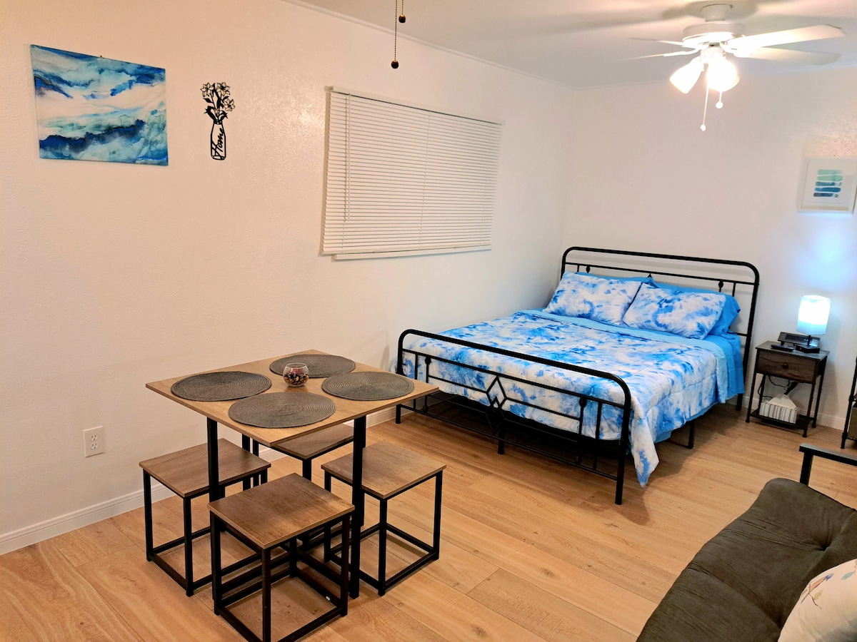 Private main door entrance, “not shared bathroom” comfortable 1-bedroom, 1-bath front side of the home, 2nd room will be 🔒 during your stay. This space is under the same roof, separated from the Host side by locked French doors covered with curtains for guests privacy Host will be using the back alley / garage entry during your stay • One Bedroom, Full size bed • Mini Kitchen * Self check in • 1 Bathroom • Street parking • Mini split * Community Pool * no access to laundry room or Patio.