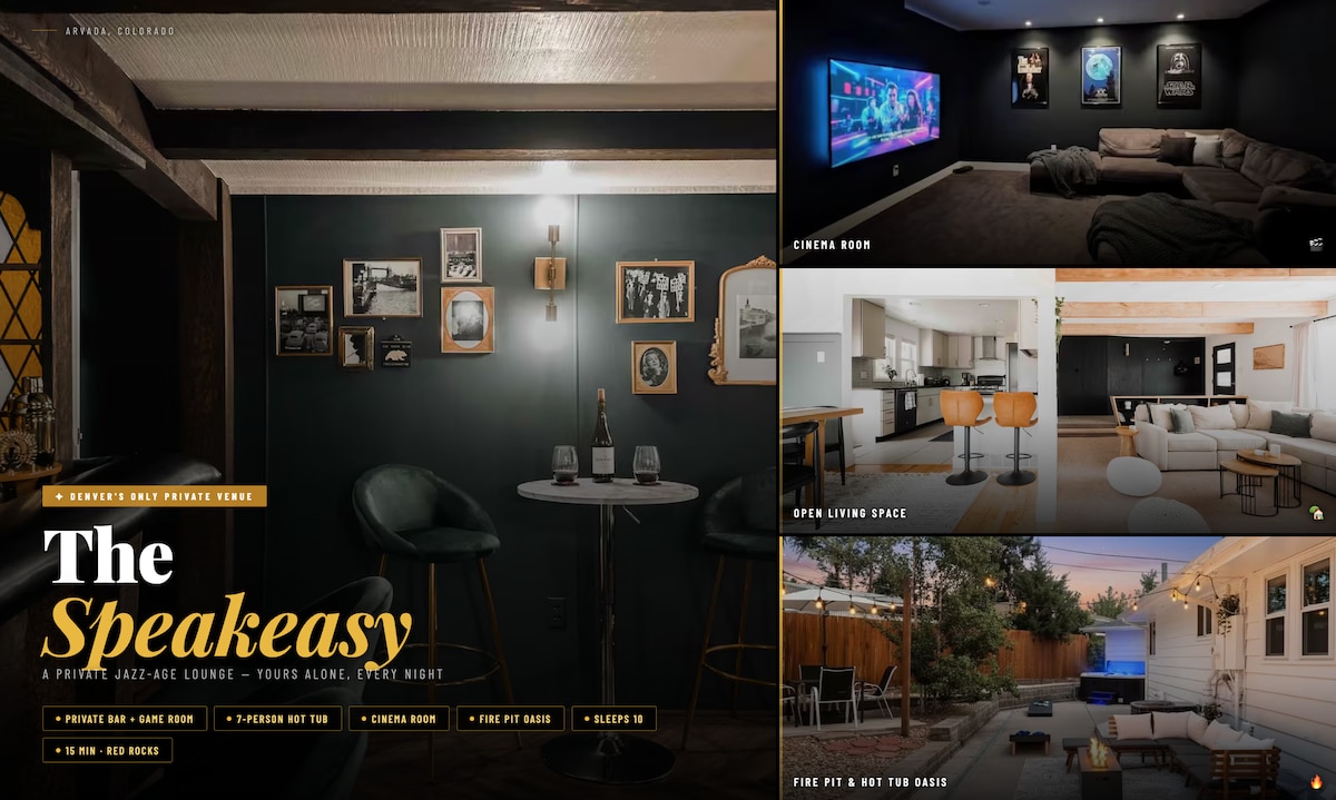 Denver’s only private speakeasy. Step behind the hidden door into your own jazz-age lounge bar. Then, emerge to a 7-person hot tub with the Rockies at your back. This 8-guest sanctuary is the ultimate Red Rocks basecamp. You can gather in the 75” cinema, or walk 12 mins to Olde Town Arvada for a night on the town. Alternatively, it's a quick 15 mins drive to Denver Downtown or RiNo Arts District. Elevate your group experience. Perfect for bachelorettes, team retreats, and reunions.