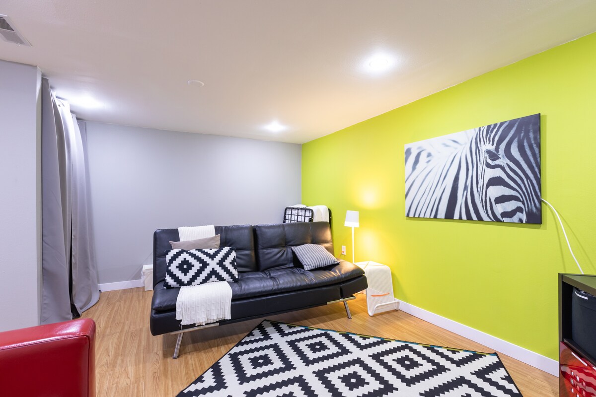 1200 sq ft basement unit with private entrance, two bedrooms one bathroom, kitchenette, office space, TV, electric fireplace, and access to transportation, bus, light rail, Lyft or Uber. Close to Redrocks (11 Miles), Golden(9 miles), hiking, skiing, rafting, and the I-70 corridor to the mountains. 15 minute drive to downtown Denver. 1 mile to Olde Town Arvada, shops, restaurants, bars, movie theater, Arvada Arts Center. G line to Denver, the Airport, and beyond!.