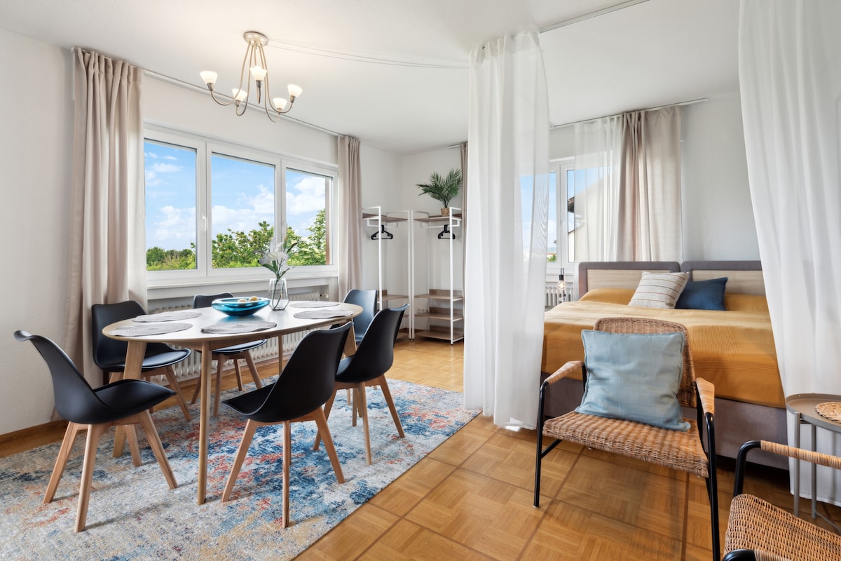 Willkommen in dieser stilvoll eingerichteten Wohnung mit liebevollen Details. Die Unterkunft bietet Platz für bis zu 7 Personen und überzeugt durch ihren großzügigen Schnitt, den großen Balkon mit Weitblick sowie eine voll ausgestattete Küche. Dank der modernen Ausstattung und der gemütlichen Einrichtung fühlen Sie sich sofort wie zuhause – einfach Gepäck abstellen und ankommen! Ideal für längere Aufenthalte Zentrumsnah: von der Haustür nur 20min zum Freiburger Hauptbahnhof Self-Check-in
