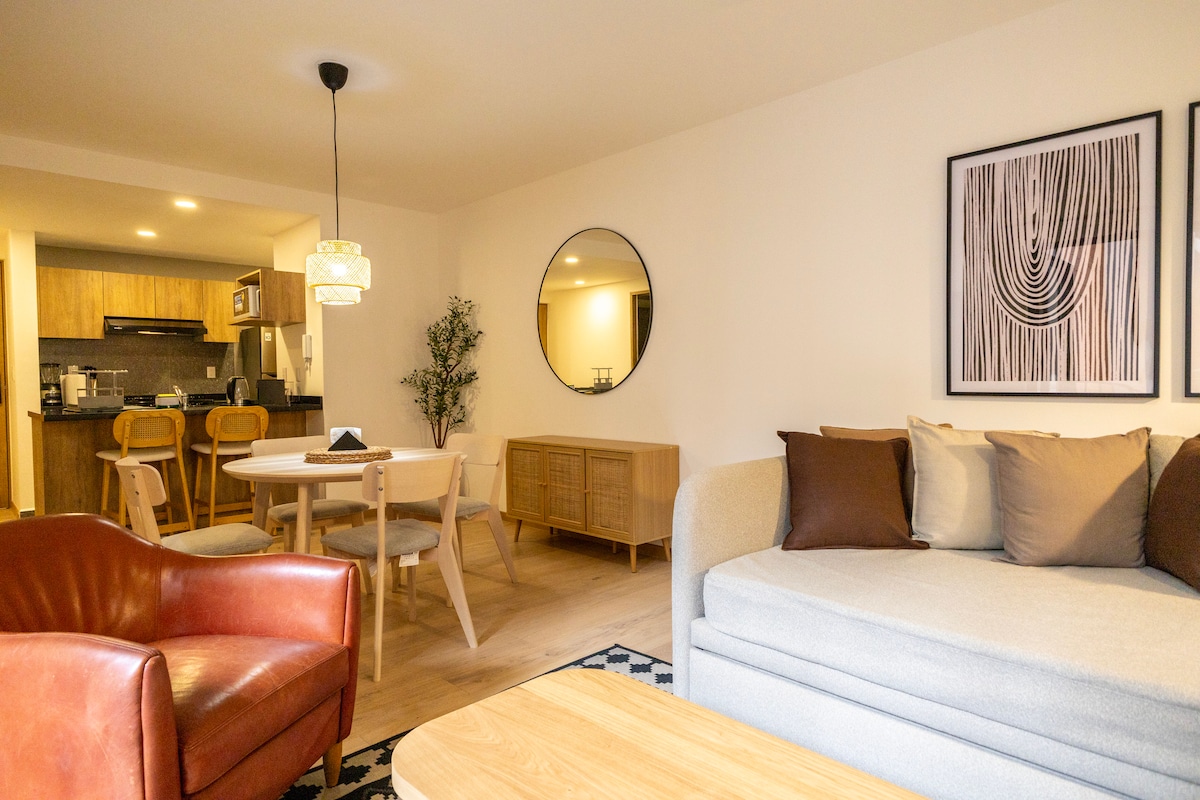 Beautiful and new apartment very close to the historic center of Mexico City. The apartment has a spacious bedroom (king size bed) full bathroom, smart TV in the bedroom and in the living area. The sofa in the living room can be converted into a sofa bed, small in size, perfect for a child. It has a fully equipped kitchen with high-end appliances. The building offers luxurious amenities: a swimming pool, a gym, a workspace area, incredible terraces for you to enjoy panoramic views of the city