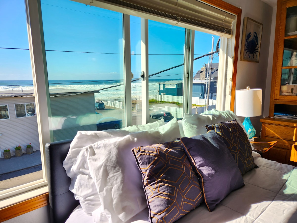 By the Waves is a 5-plex offering ocean view lodging in a beach-side community. This suite is on the 2nd floor, has 2 queen beds and accommodates up to 4 adults or a party of 5 with children. 6ft Jacuzzi tub. 2 TVs. Shared ocean view hot tub! Stair-free, city-beach access for beach-combing. As a company policy, we require your home address and a current phone number, when you book. We are pet-free There is a 2 night min. stay policy, a 3 night min. in summer & 4 nights 4th of July.