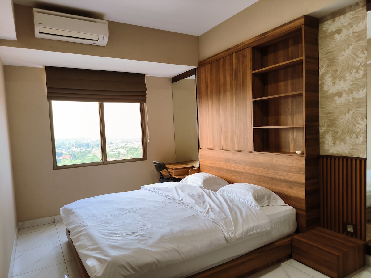 The Japandi style studio makes you feel comfortable and relaxed. The view towards Taman Mini Indonesia Indah (TMII) is a relief because it is far from the hustle and bustle of the city. Please make a reservation at least 24 hours before check-in time.
