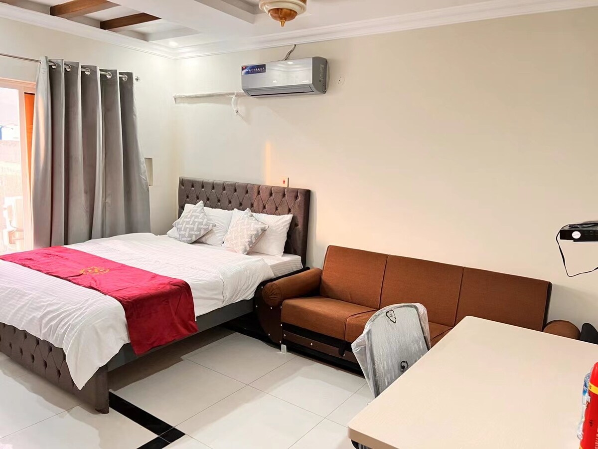 Welcome to Crib-O, a chic and modern one-bedroom apartment in Islamabad. Enjoy an Egyptian-themed bedroom, Brooklyn-themed TV lounge, PS4, Netflix, a fully functional kitchen, and a comfortable L-shaped sofa. The building has secure parking, laundry services, a gym, and snooker. You can also enjoy a grocery store, restaurant, and breakfast services. The apartment is just a 5-minute walk from NUST university, washroom amenities, and 600 thread count bedding. Stay in style and comfort at Crib-O.