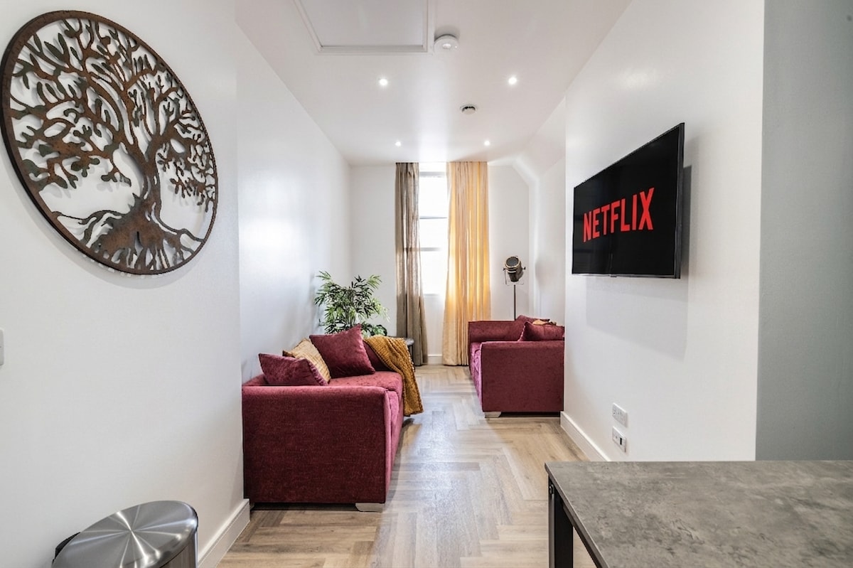 Luxury apartment on leafy New Walk with panoramic Museum Square views from bedroom and lounge through sash windows. Awaken in a kingsize bed adorned with Egyptian cotton linen. Coffee machine & fully-equipped kitchen—fit for cooking a full English or roast dinner—with museum view dining. 65” 4K TV with Netflix. Soft lighting, rainfall shower. 5 mins from station; De Montfort Hall 10, Curve 8, Tigers Stadium 12 mins. Peaceful, stylish haven on Leicester’s gem, New Walk 🍃