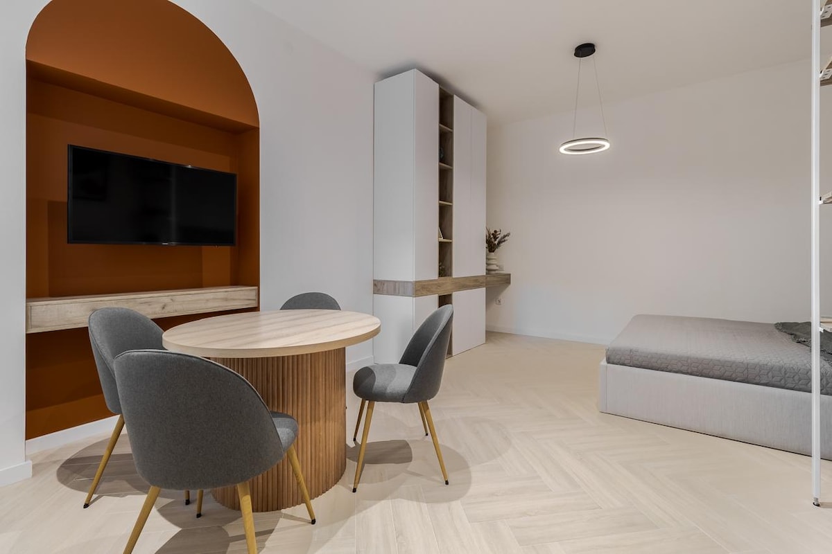 New apartment in the heart of the city located on a quiet street will allow you to relax despite the noise outside the door. The room has everything you need even for your long stay: fitted kitchen, refrigerator, induction hob and everything you need for cooking ,washing machine with dryer,internet and smart tv.Near restaurants,entertainment venues,cathedral,aquarium. Wellcome🩵💛