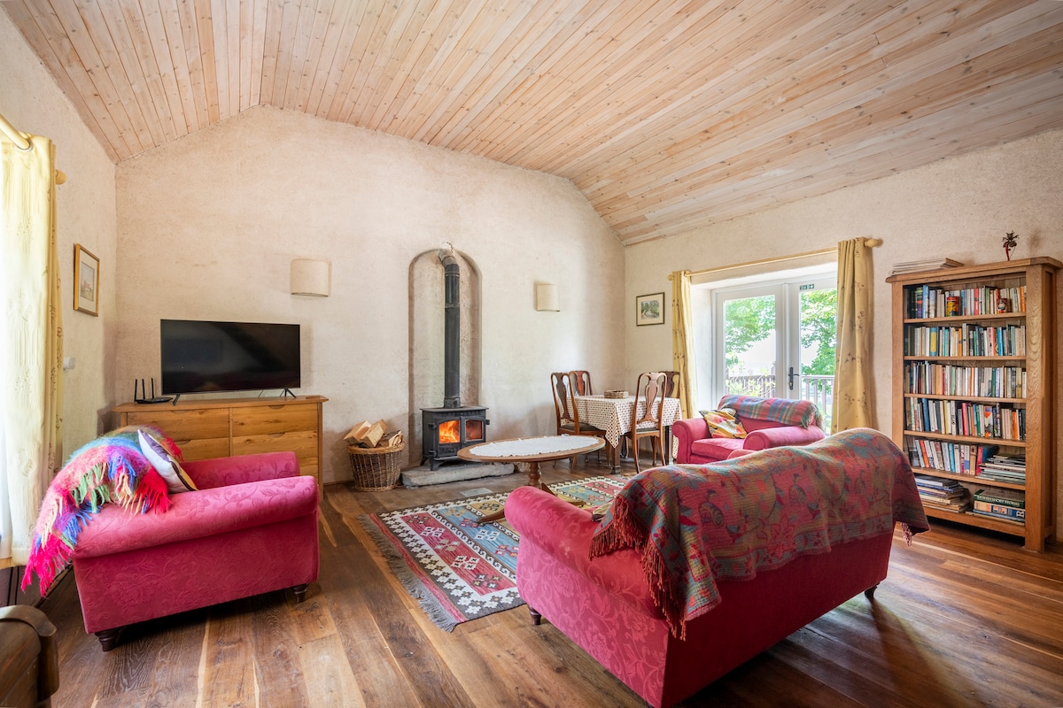 A 10-minute drive from the centre of Derry, the Avish is a very spacious 18th-century farm cottage set in its own courtyard and grounds and lovingly restored. It's cosy, secluded and totally charming. Sleeps 4-6 very comfortably. Kitchen with programmable wood-pellet stove. Skullery, large living room, mezzanine with sofabed, double bedroom, twin bedroom with single beds, bathroom with walk-in shower and roll-top bath. Garden, private courtyard and parking. TV & Wifi. Minimum stay 3 nights.