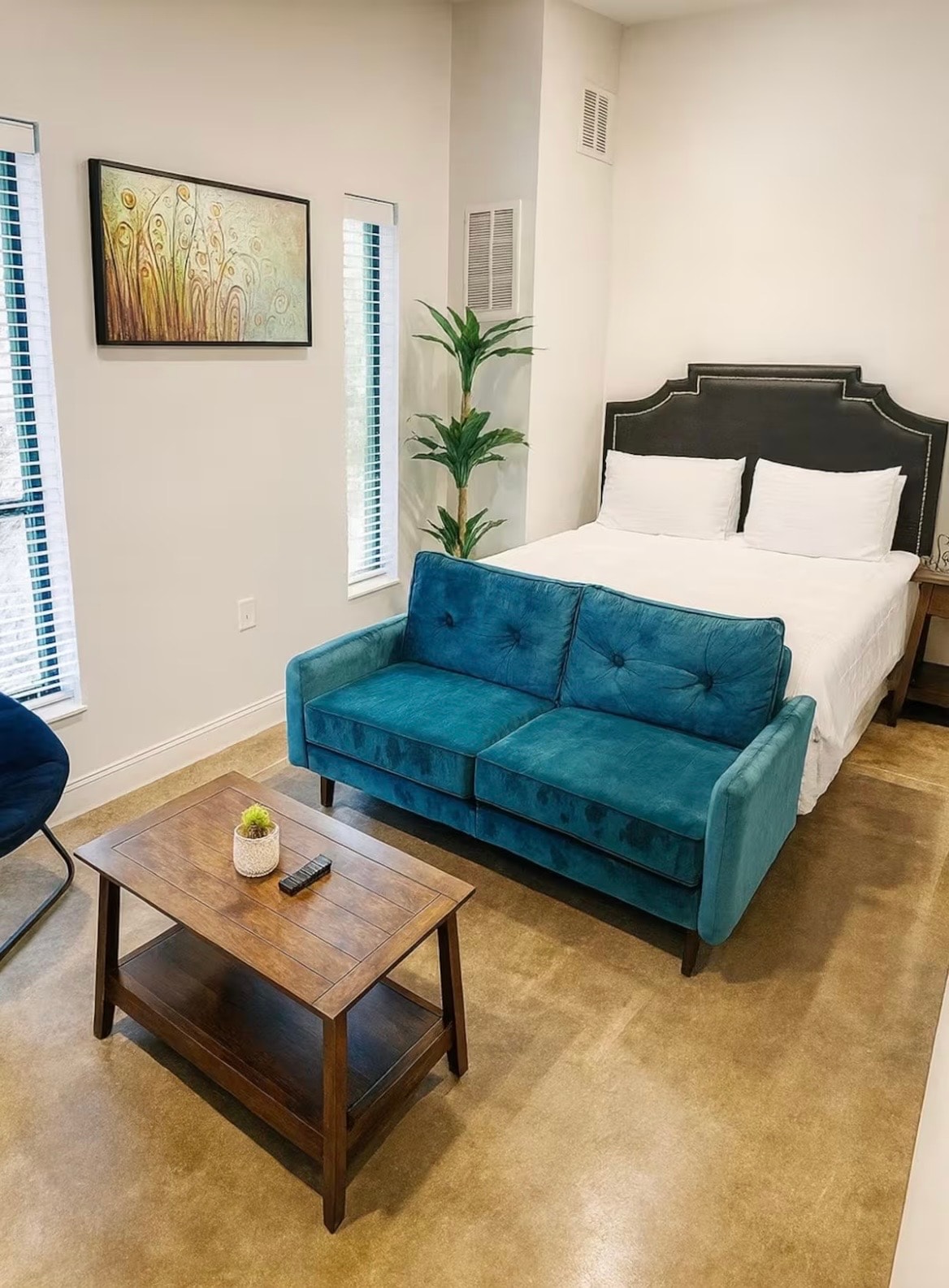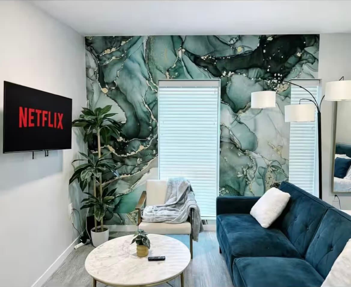 Welcome to the Urban Jungle Retreat! This stunning studio is a bold blend of sleek black interiors and lush greenery, featuring a striking grass wall that brings nature indoors. Relax in the comfort of a luxurious king-size bed in a modern, stylish space. Located in downtown Des Moines, you're just steps away from the trendy East Village, Des Moines Riverwalk, and Historic Court District. Enjoy the ultimate urban escape where city vibes meet natural elegance.