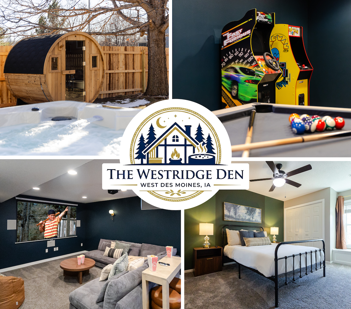Welcome to The Westridge Den- your ideal home base in West Des Moines. 3 min to Jordan Creek Town Center and 15 min to Downtown Des Moines, this expansive 5BR/3.5BA home is built for gatherings. Soak in the hot tub, unwind in the barrel sauna, enjoy alfresco patio dining, roast s'mores, and let the kids play in the 3-season outdoor play area. Includes movie theater and game room with pool table, air hockey, arcade games, bar, fire pit, yard games & TVs in every room. Memory-making starts here!