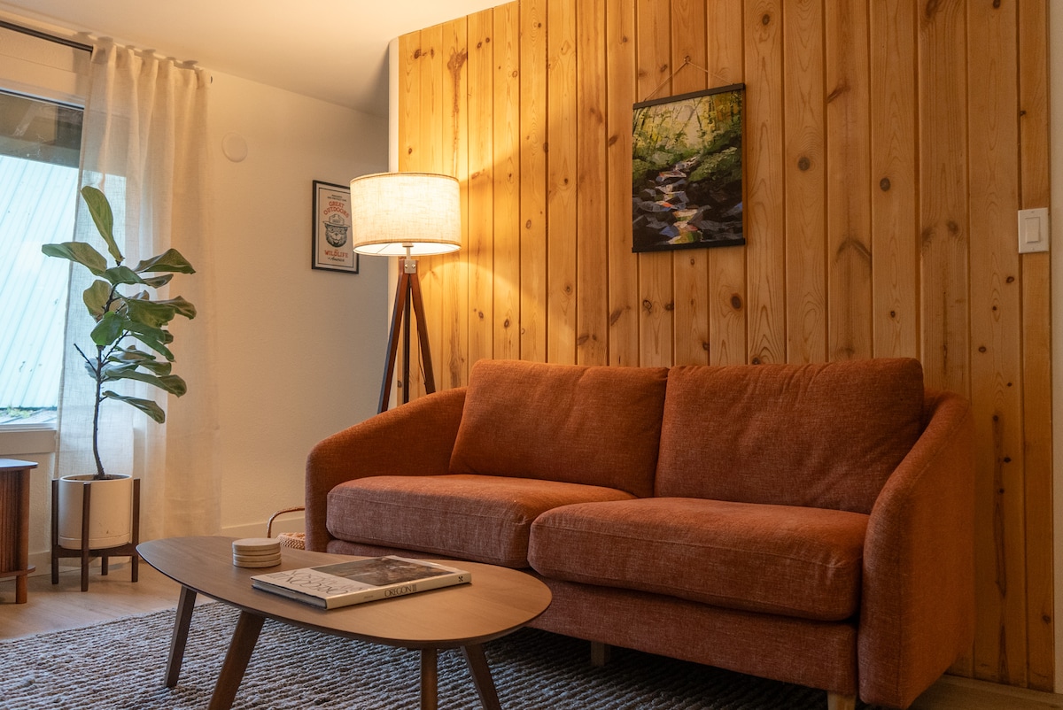 Located in Bend's Midtown and with access to the Larkspur trail that leads to iconic Pilot Butte, this bright, newly built 450 sq. foot apartment balances cozy and modern elements to make your stay in Bend comfortable. Equipped with a full kitchen, a separate room with a queen bed, a deep, relaxing tub, a sofa that converts into a memory foam queen bed, a TV with access to Netflix, and a separate laundry room. Our space is a great option for 2 guests, but it can fit up to 4.