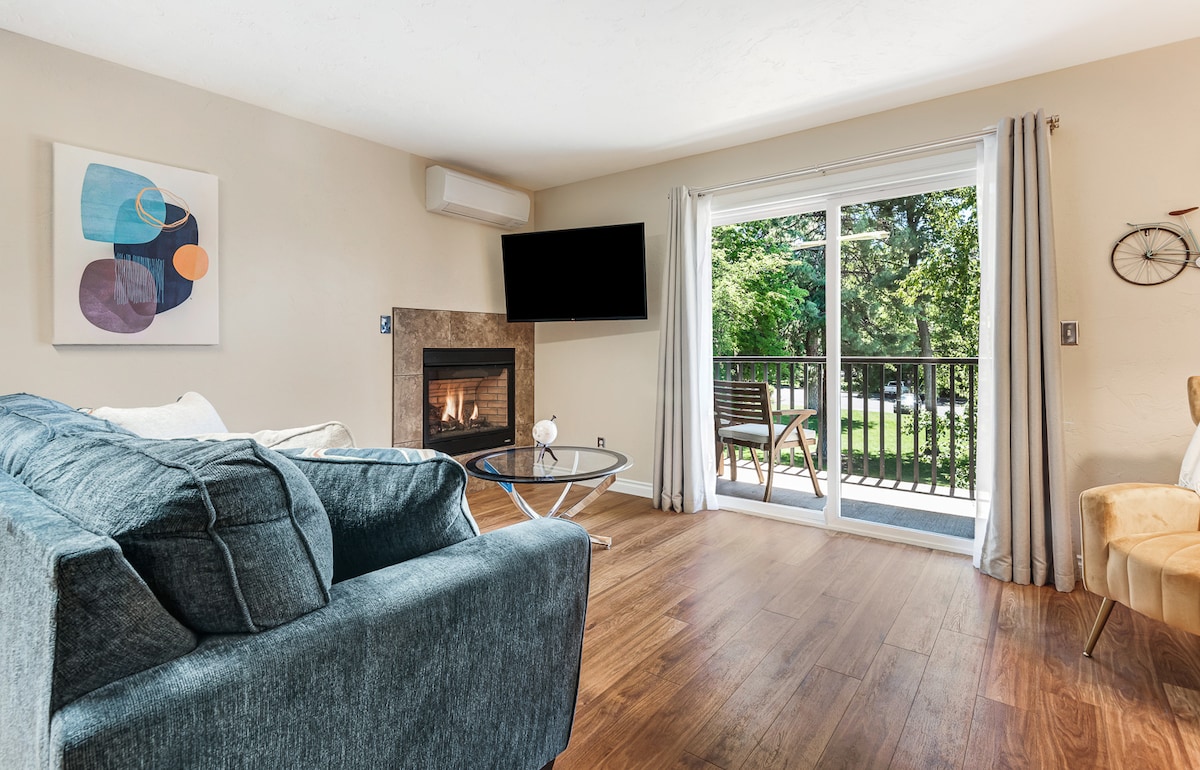 A perfect home base for all your adventures in Bend! Just a 10 minute walk from downtown. Walk or bike to the best restaurants and breweries in Bend. Swimming, hiking, and fishing in the Deschutes river steps from your doorway. King Bed~ Gas fireplace ~ Reading nook ~ Comfy queen sleeper sofa ~ Air Conditioning ~ Games ~ 2 TVs ~ Full kitchen ~ 2 balconies ~ Keyless Entry ~ Shared laundry room ~ 2 Bathrooms ~ K Cup coffee bar ~ Private WiFi ~ Roku TVs