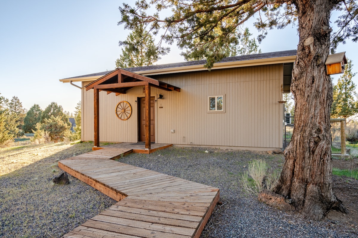 Enjoy our recently completed lofted guest house. Just 3.7 miles from smith rocks and walking distance to Terrebonne restaurants, coffee and local grocery store. Centrally located, 15 min to the airport and just a 30 min drive to Bend. Our guest house has a fully stocked kitchenette ( NO OVEN) with a toaster oven/air fryer, and an induction cook top. Sit back and relax outside in the Adirondack chairs while drinking a Nespresso coffee. Wifi is provided as well as a Roku T.V and DVD.