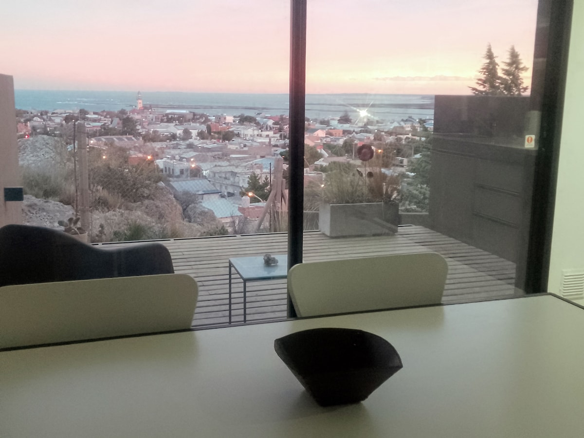 Disfruta de una estadía de lujo, estamos ubicados en lo alto de Puerto Deseado, con excelente VISTA A LA CIUDAD Y EL MAR, de estilo minimalista, completamente amoblados y equipados, con todo lo que necesitas para una estadía placentera, el dúplex tiene 74 m2, esta distribuidos en dos niveles: Planta baja: Estar con sofá, cocina/ comedor con salida a deck. Planta alta: Dormitorio principal con somier queen size, otro dormitorio con dos somieres individuales y baño.