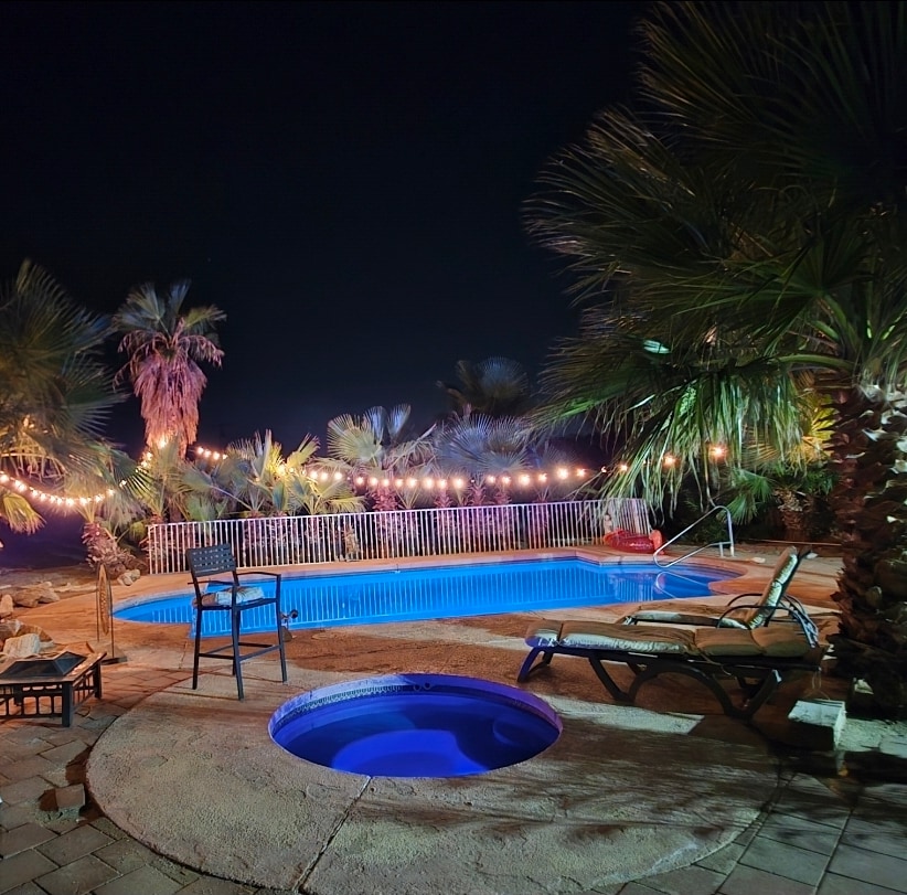 Escape to this serene Desert Oasis atop the Spa Zone, where sweeping mountain views meet total tranquility. Soak and stargaze in the spa, relax under dramatic outdoor lighting, and enjoy fully gated privacy amid lush landscaping. Walk to local spas, a museum, and dining, or step outside for a hike across the street. Perfectly situated between Joshua Tree and Palm Springs in an area celebrated for healing hot springs—and nestled within a powerful positive energy vortex.