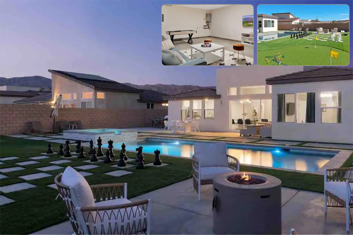 Enjoy a stylish experience at this centrally located gorgeous home. A short 15 min drive will have you in the heart of downtown Palm Springs.This brand new construction, 3 bdr home is the perfect spot to come enjoy your next vacation. Tastefully decorated, new comfortable furniture, a fully set up indoor game room, & a huge backyard with outdoor games will be sure to keep you & your guests entertained! Permit: VRP23-0024