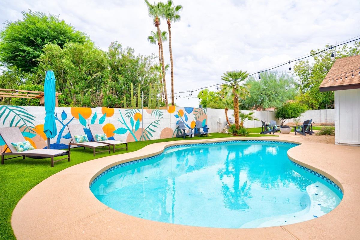 Turquoise Palms – Your Scottsdale Escape 🌵 Cook in a fully stocked kitchen 💦 Splash in the heated pool ☀️ Relax in submerged baja chairs 🎮 Challenge each other at Golden Tee 🔥 Fire up the grill and enjoy the Arizona sun in your private backyard oasis 📍 Centrally located for shopping, dining, and desert adventure Whether it’s kids laughing in the pool, grandparents enjoying quiet moments, or everyone gathered around the grill, Turquoise Palms is where family memories are made.