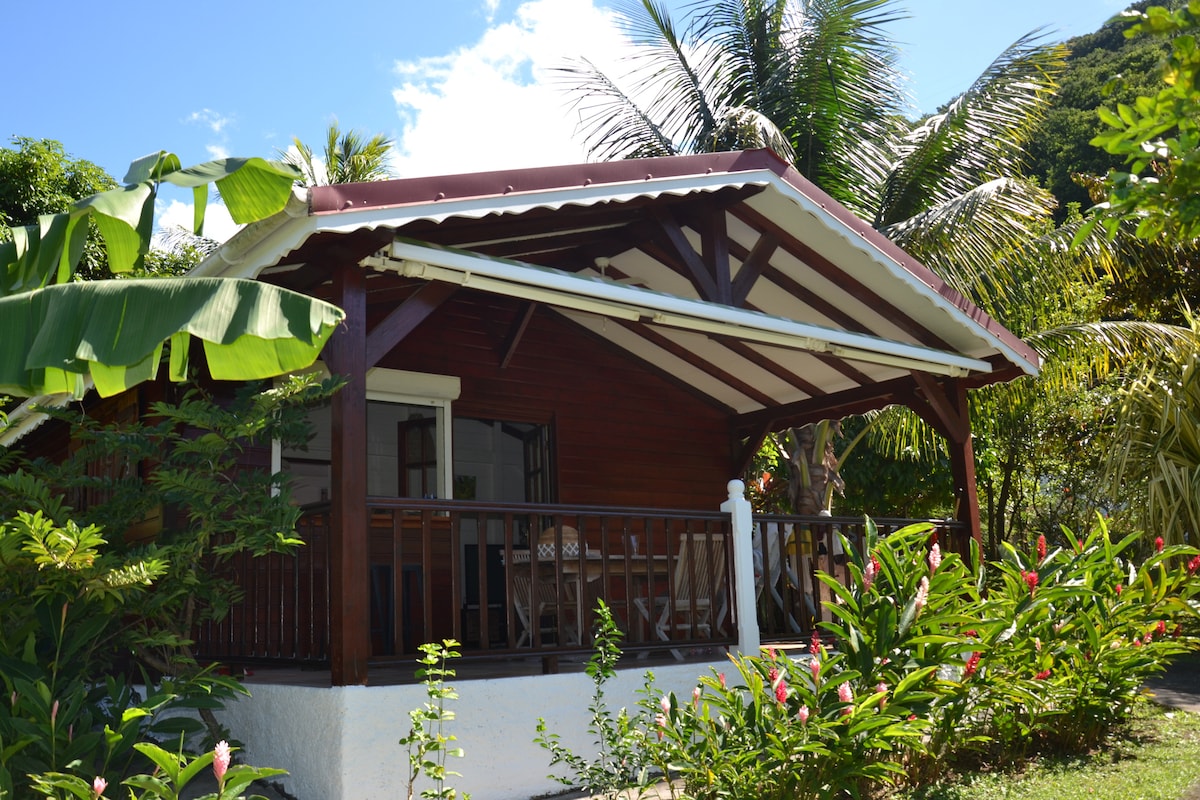 In a setting of tropical vegetation, our small family structure is made up of three independent wooden bungalows around a large salt pool. Depending on the season, you can enjoy the many flowers and fruits in our garden. We are located on the heights of Deshaies, 50 meters from the Botanical Garden. Breakfast in supplement is served on reservation and in complete privacy on your terrace.