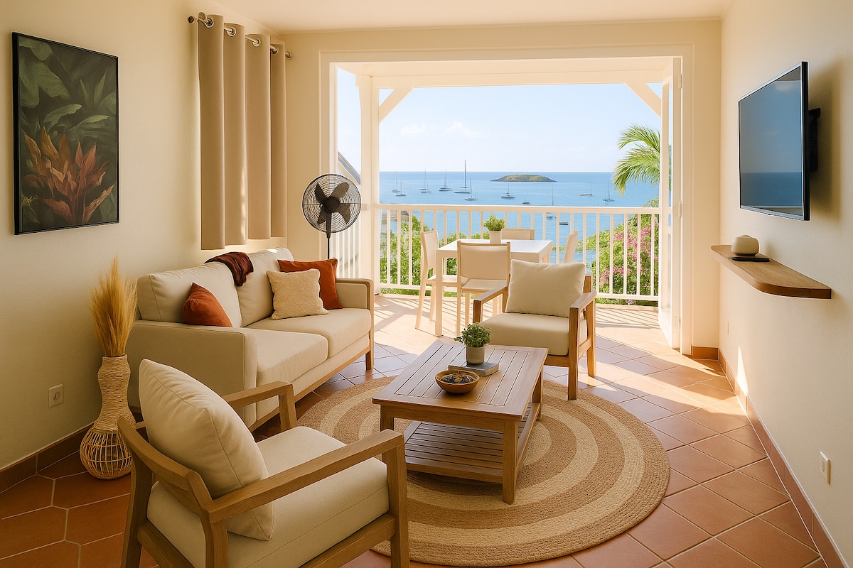 Charmante villa neuve vue panoramique sur mer des Caraïbes, piscine, entrée et parking privatifs. Première ligne dans un domaine clos avec accès direct crique, proche plages Leroux et Petite-Anse. Deux grandes chambres climatisées (2 à 4 hôtes), lits king-size, moustiquaire, dressing. Spacieuse salle de douche, toilettes et buanderie séparés. L'espace de vie comprend une terrasse-séjour avec stores électriques, brasseurs d’air, téléviseur, wifi, et cuisine ouverte entièrement équipée, plancha.