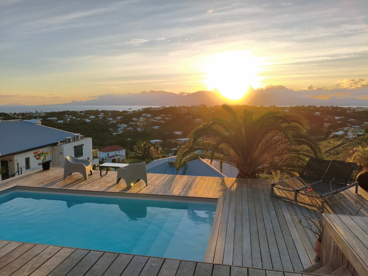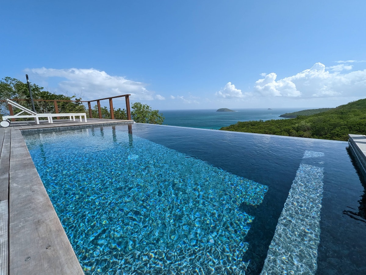 Nestled on a natural view point overlooking the Caribbean Sea, the 5-star Villa Blue Moon is one of the exceptional villas offered by *Blue Haven Villas Guadeloupe*. Sleeps 2. - Salt-water pool just steps from the super-king-size bed facing the sea with unopposed views. - Mosquito nets on windows and bed. -Fully equipped kitchen; Nespresso, dish & clothes washer, oven... - 180° view and sea access to one of the most beautiful snorkeling spots. - snorkelling gear - Parking, a-c, BBQ, Wi-Fi