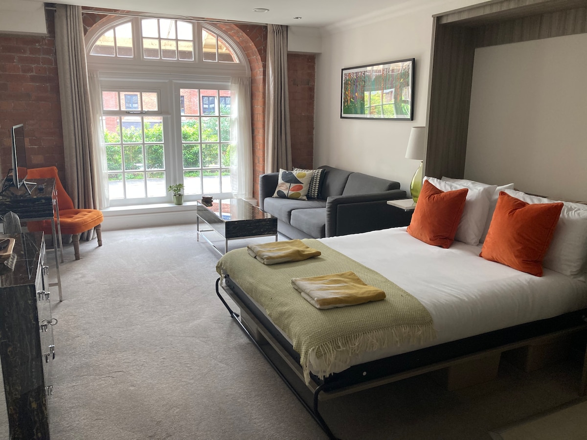 Enjoy our stylish 1-bed ground floor New York 'loft' style space. Directly on the river and one of only a handful of apartments like this in the city. Watch the water flow by your window seat, so close you’ll want to reach out and dabble! York’s most historic industrial building (1864), so peaceful yet 5 mins from city centre. Elegant mix of cool & comfort, original 19th-century brickwork. High spec includes QLED TV, king-size bed & modern quartz worktop kitchen. Privately owned/operated.