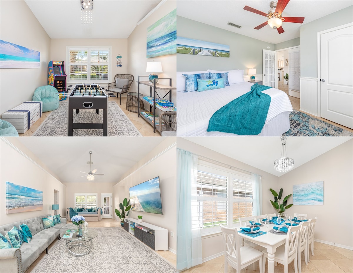 Our beautiful home is completely updated and features clean and comfortable furnishings. The home offers both front and back screened-in porches, with the back overlooking the water. The brand new beautiful pool is less than a 40 yard walk. Our one-story home is in the heart of the Sandestin Resort. We are in the center of everything- four golf courses, the tennis center, pickleball, marina with restaurant, walking paths, fishing, shopping, beach- all within a 5 minute golf cart ride.
