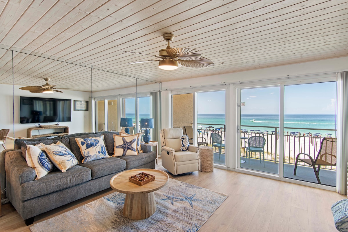 NEW LISTING! Wake up to endless Gulf views in this beautifully remodeled 2BR beachfront condo at Emerald Towers. This south-facing retreat features a king master suite, queen guest room, luxury foam mattresses, and a private balcony overlooking the emerald waters of Destin. Enjoy mirrored walls reflecting the ocean throughout the living space, a fully equipped kitchen, Roku TVs, beachfront pool, gym, and gated access. Located in the heart of Destin with the beach just steps away.