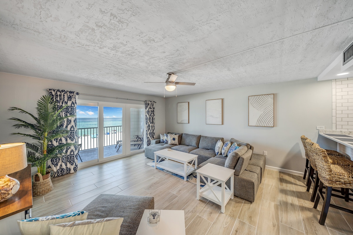 Completely renovated in 2022, this beautifully updated gulf front condo will surely impress! Mariner West is a small, quiet complex located on the east end of PCB and offers a heated pool, tennis/pickleball and shuffleboard courts, & outdoor grilling area.