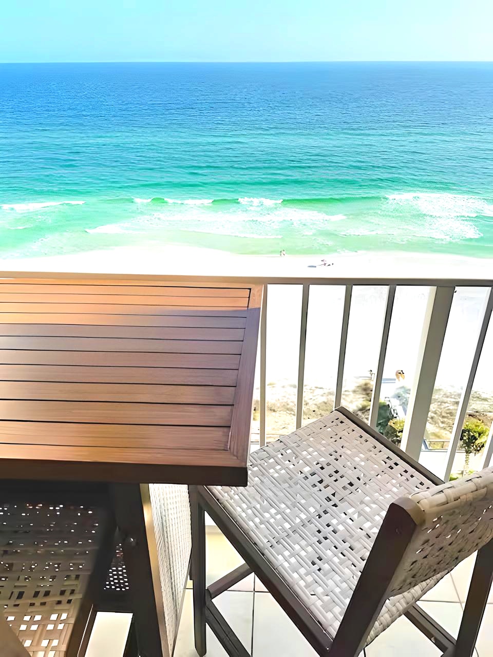Beachfront Corner Condo in Destin - Panoramic Gulf Views Summer dates just released! Experience luxury in our Destin beachfront condo! This 3-bedroom, 2-bath unit offers panoramic Gulf views from the living area, kitchen, and master bedroom. Enjoy a renovated balcony, heated pool, tennis, basketball, pickleball, gym, and sauna. Beach chairs and umbrella included March-October. Convenient elevator and steps access. Book your Destin vacation rental now for an unforgettable beach getaway!