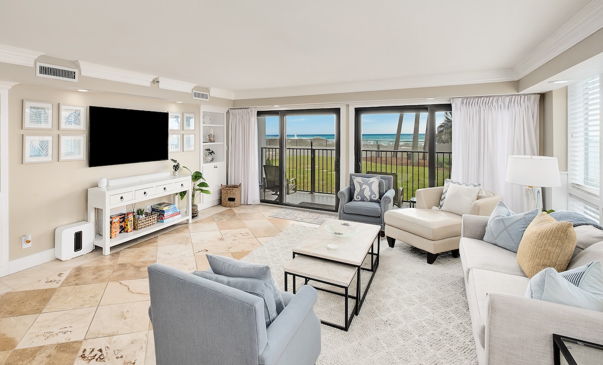 Paradise awaits at your beautiful, beachfront condo with stunning beach views of the PRIVATE BEACH from your own private balcony. The sweeping views continue from inside, through the large windows & sliding glass doors, including an ocean view from the master bedroom. This well appointed, family friendly unit offers 3 bedrooms, sleeper sofa, & 3 full bathrooms to comfortably accommodate 6-8 people. Complimentary Beach Service (2 chairs & umbrella) is included March-October, & 4 bikes year round