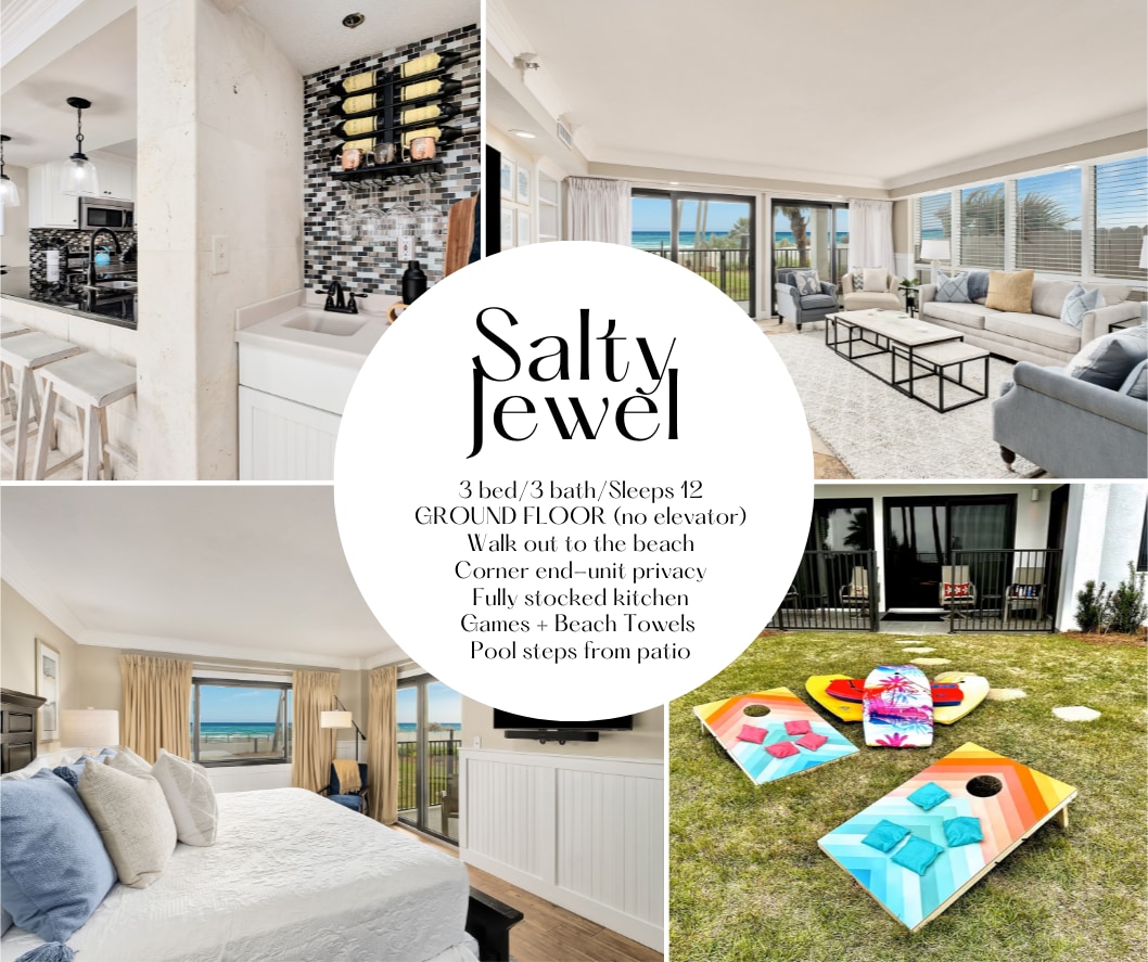 Beachfront Corner Condo in Destin - Panoramic Gulf Views Summer dates just released! Experience luxury in our Destin beachfront condo! This 3-bedroom, 2-bath unit offers panoramic Gulf views from the living area, kitchen, and master bedroom. Enjoy a renovated balcony, heated pool, tennis, basketball, pickleball, gym, and sauna. Beach chairs and umbrella included March-October. Convenient elevator and steps access. Book your Destin vacation rental now for an unforgettable beach getaway!
