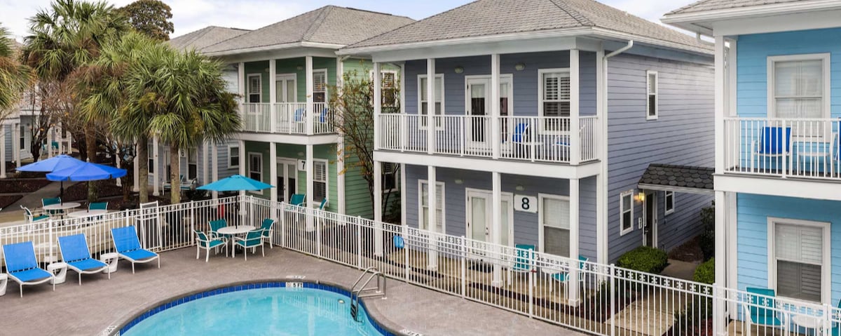 4 pools (Main lagoon pool, giant hot tub with island, kiddie pool with splash pad, and one heated pool). Live music at the poolside bar/restaurant with plenty of games to indulge in, gym (free weights, machines, and cardio), free hotel shuttle to public beach access or just a short walk, playground, 2 tennis courts, basketball court, indoor pickle ball court, picnic area with BBQ. Condo amenities: fully finished with washier/dryer, full kitchen, and private patio.