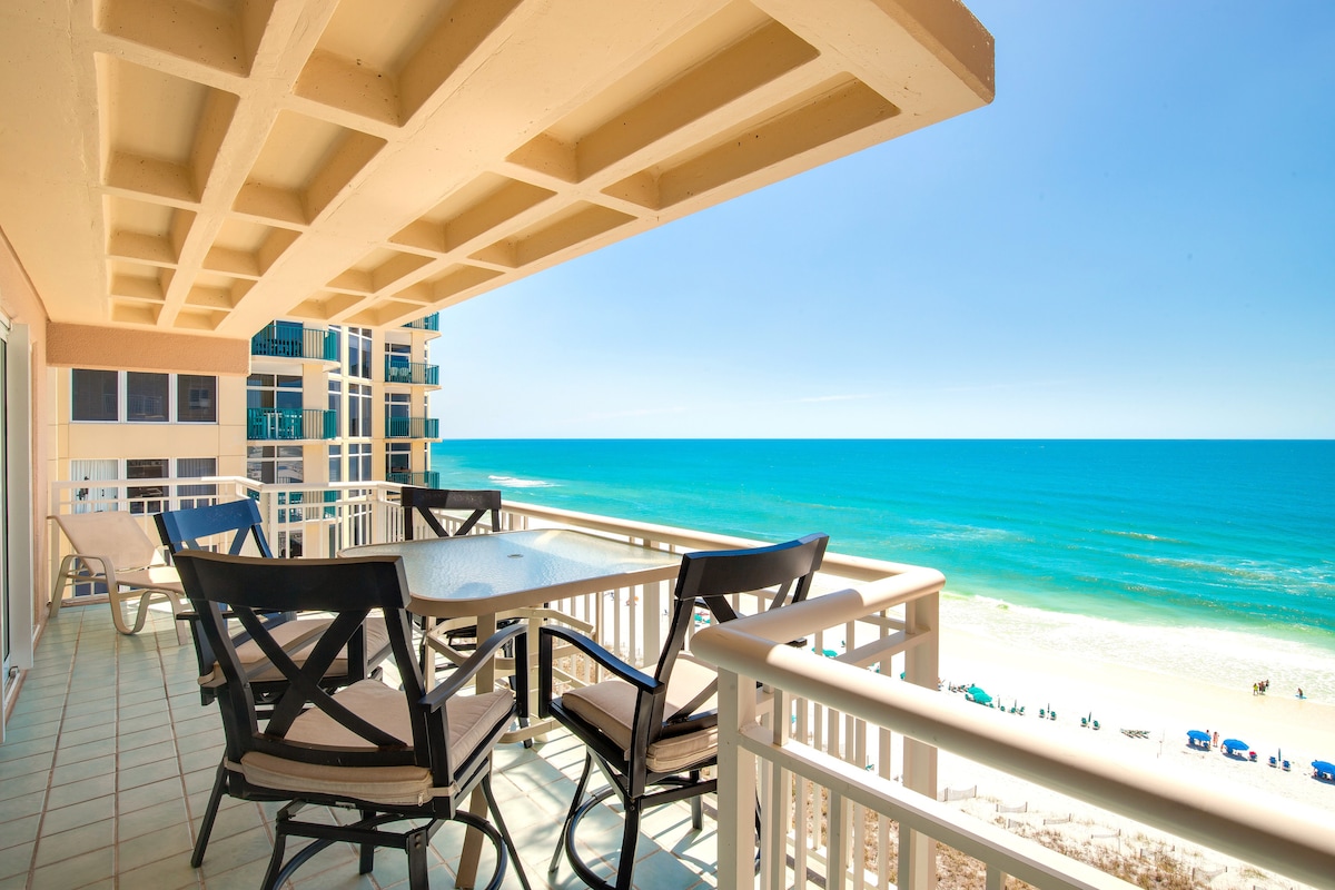 Enjoy your luxury stay at 'Beachfront Bliss' a beautiful, spacious, beachfront condo at the Pelican Beach Resort in Destin Florida. Enjoy your coffee and cocktails from an 8th floor balcony with breathtaking beachfront views of the Gulf of Mexico. This condo is professionally decorated and includes a fully equipped kitchen, sleeper sofa, bunk beds, high speed internet, beach chairs/umbrella/cooler, poolside Tiki Bar, 3 pools, 2 spas, fitness center, sauna, and is close to Harbor Walk!