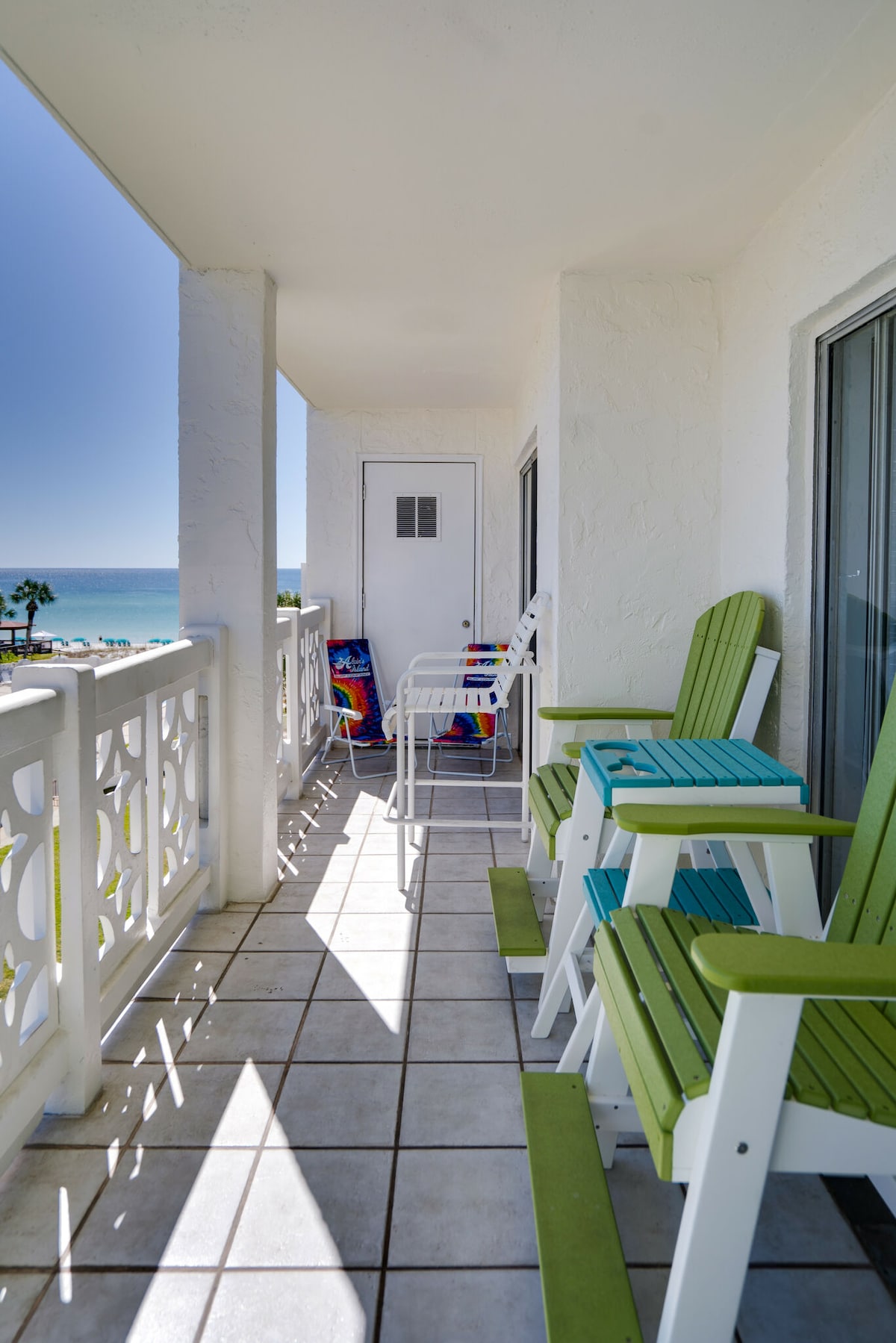 Beachfront Corner Condo in Destin - Panoramic Gulf Views Summer dates just released! Experience luxury in our Destin beachfront condo! This 3-bedroom, 2-bath unit offers panoramic Gulf views from the living area, kitchen, and master bedroom. Enjoy a renovated balcony, heated pool, tennis, basketball, pickleball, gym, and sauna. Beach chairs and umbrella included March-October. Convenient elevator and steps access. Book your Destin vacation rental now for an unforgettable beach getaway!