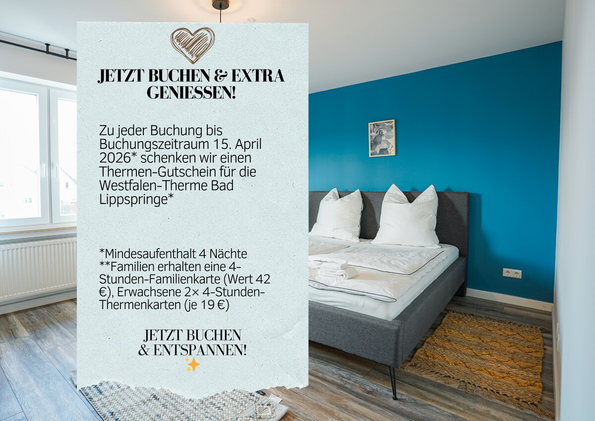 Vergiss deine Sorgen – in dieser geräumigen und ruhigen Unterkunft. Auf 70qm mit großem Sonnen-Süd-Balkon und Blick ins Grüne einfach die Seele baumeln lassen & entspannen! Wenn du mit deinem Auto anreist kannst du es ganz bequem direkt vor der Tür parken. Die Westfalentherme mit Saunabereich & Schwimmbad liegt 6 Gehminuten entfernt. Ebenso weit ist es zum Bäcker und zu 2 Supermärkten. Auch der Kurwald liegt um die Ecke!