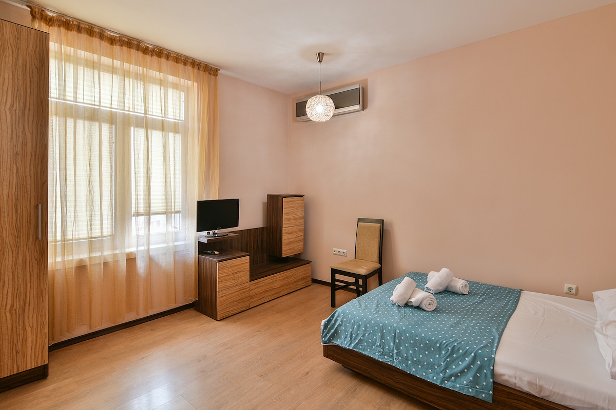 Located in the heart of Varna, this cozy and stylish one-bedroom apartment offers king size bed, cozy living room, well equipped kitchen, spacious bathroom and balcony. The property enjoys a prime location just 350 m from the Central Beach, 50 m from the Sea Garden of Varna, and 150 m from the vibrant pedestrian promenade. All attractions, bars, and restaurants are within walking distance. We look forward to welcoming you.