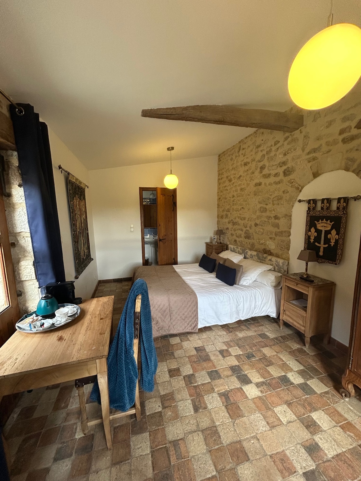 The Napoléon Suite is located on the 1st floor of the castle. It has a bedroom with 1 king size bed finely decorated in the colors of the Napoleonic era. The suite, like all our rooms, has a private bathroom with shower and toilet. The suite will take you a few decades back and remind you of the French emperor's most glorious years.