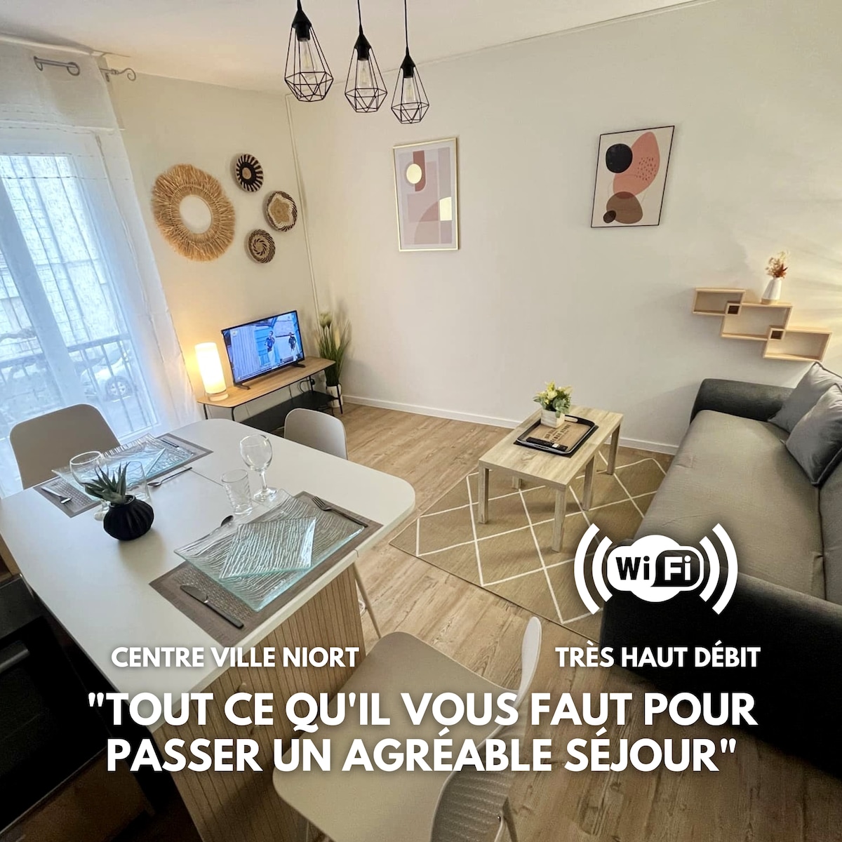 Modern and cozy studio apartment with a balcony in the heart of Niort. Located in the city center, this 25 m² studio offers an exceptional location. Enjoy its balcony, complete with a private parking space, ideal for relaxing. Fully equipped (double sofa bed, kitchenette), it's perfect for exploring the Marais Poitevin. Pets welcome. This studio offers a unique experience combining comfort, practicality, and local charm. Laundromat, bakery, and newsstand nearby. Enjoy!