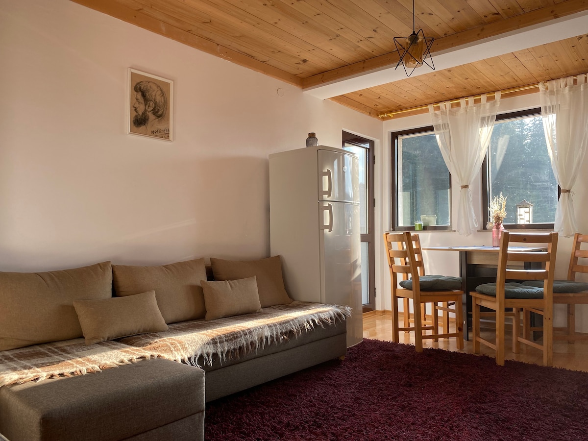 Experience the magic of Rhodopean mountains. Come to a beautiful panoramic house with private bathroom and large balcony with mountain view. The house is part of the guest house called "Milka". There is a kitchen guests can use inside the spacious room and a sofa which can be used as a bed for one or two people. Enjoy the mountain view while relaxing in a hot tub. It is paid additionally and costs 30 BGN/hour and can fit 5 people. At the house you can order traditional breakfast and dinner.