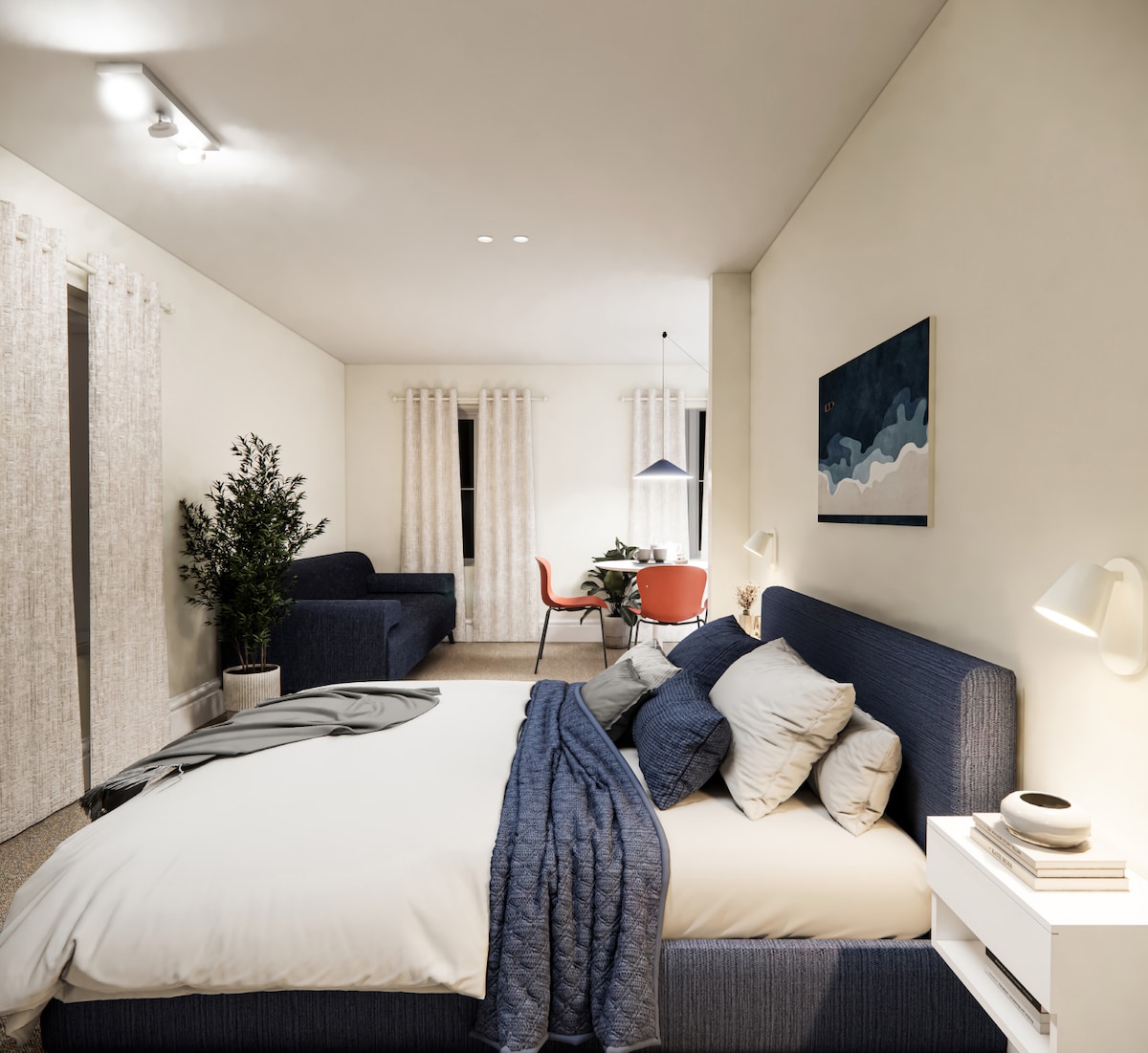 Full of charm, this north-facing two-bedroom deluxe apartment spans 68 sqm over two levels. The main floor offers a bedroom, bathroom, living area, and full kitchen, while the upper level features a second bedroom in Trehawke House’s original turret for added privacy. With two bathrooms, separate living spaces, and views over the historic main street, it’s ideal for families or friends, blending period character with modern comfort in the heart of Liskeard.