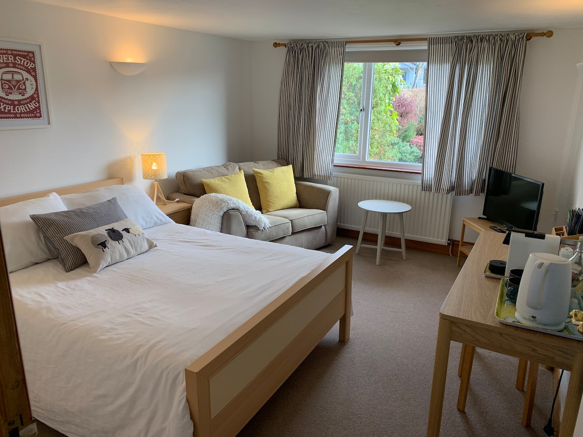 Welcome to the Maple Room, a private en suite guest unit in our family home. The room has its own private entrance, it is completely self contained and comprises of an entry room and an en suite bedroom. We are in the beautiful medieval "river and market" town of Totnes, home to many independent shops and eateries, close to beaches, Dartmoor and many walking and hiking trails. Our house is on a hill overlooking the town, with gorgeous views, and the high street is a 10/15 minute walk away.