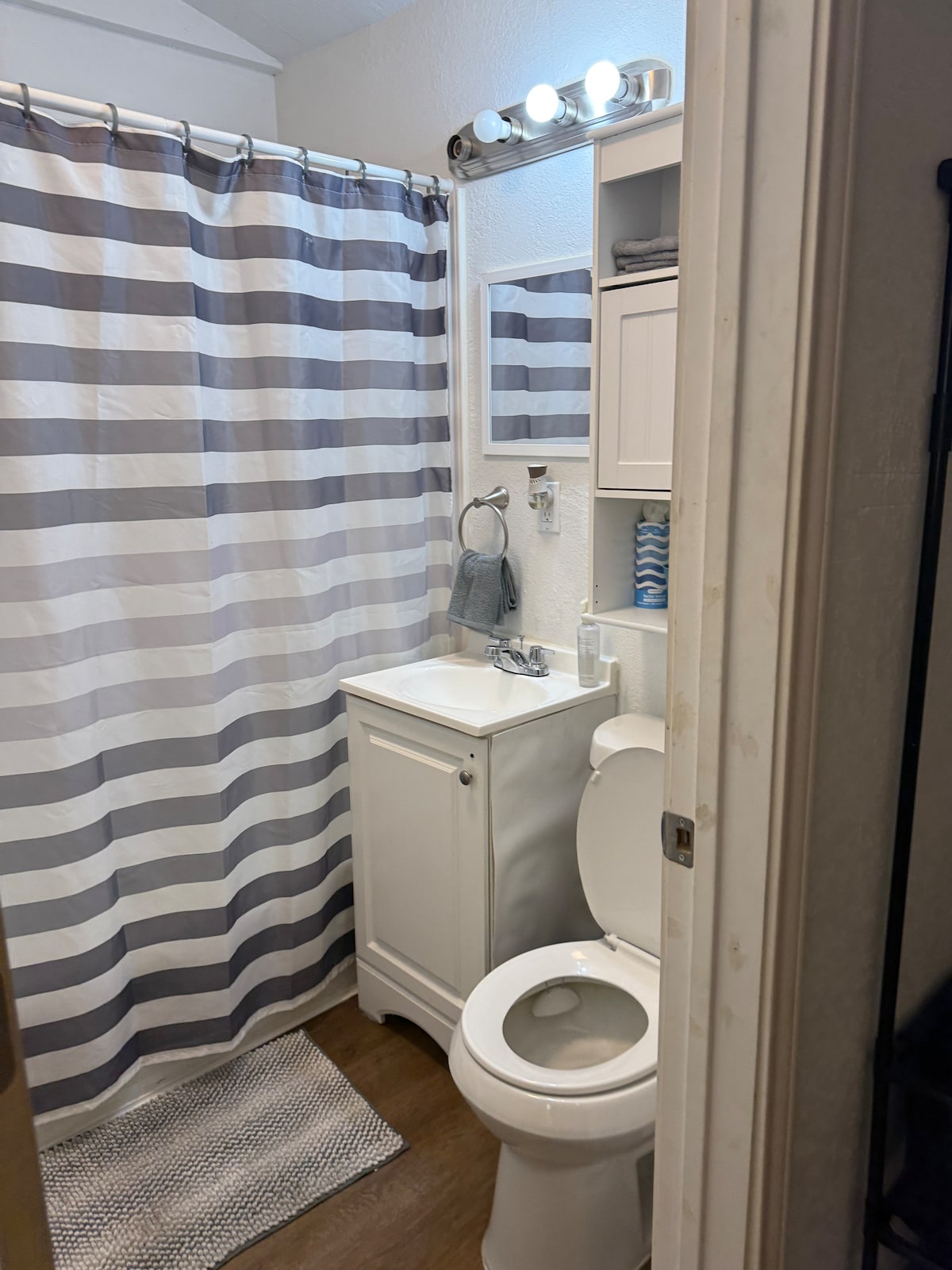 You won’t forget the peaceful surroundings of this rustic destination. In a friendly family Rv park where relaxing is never ending! Welcome to our tiny home! We have a fully furnished and ready to use, two bedroom one bath Rv! Three bunk beds in back room and a queen in the master! Back room has a couch that folds out into a bed as well as the table and couch in living room! Equipped with a fire place for your cozy nights, and a built in grill on the outside for your afternoon gatherings.