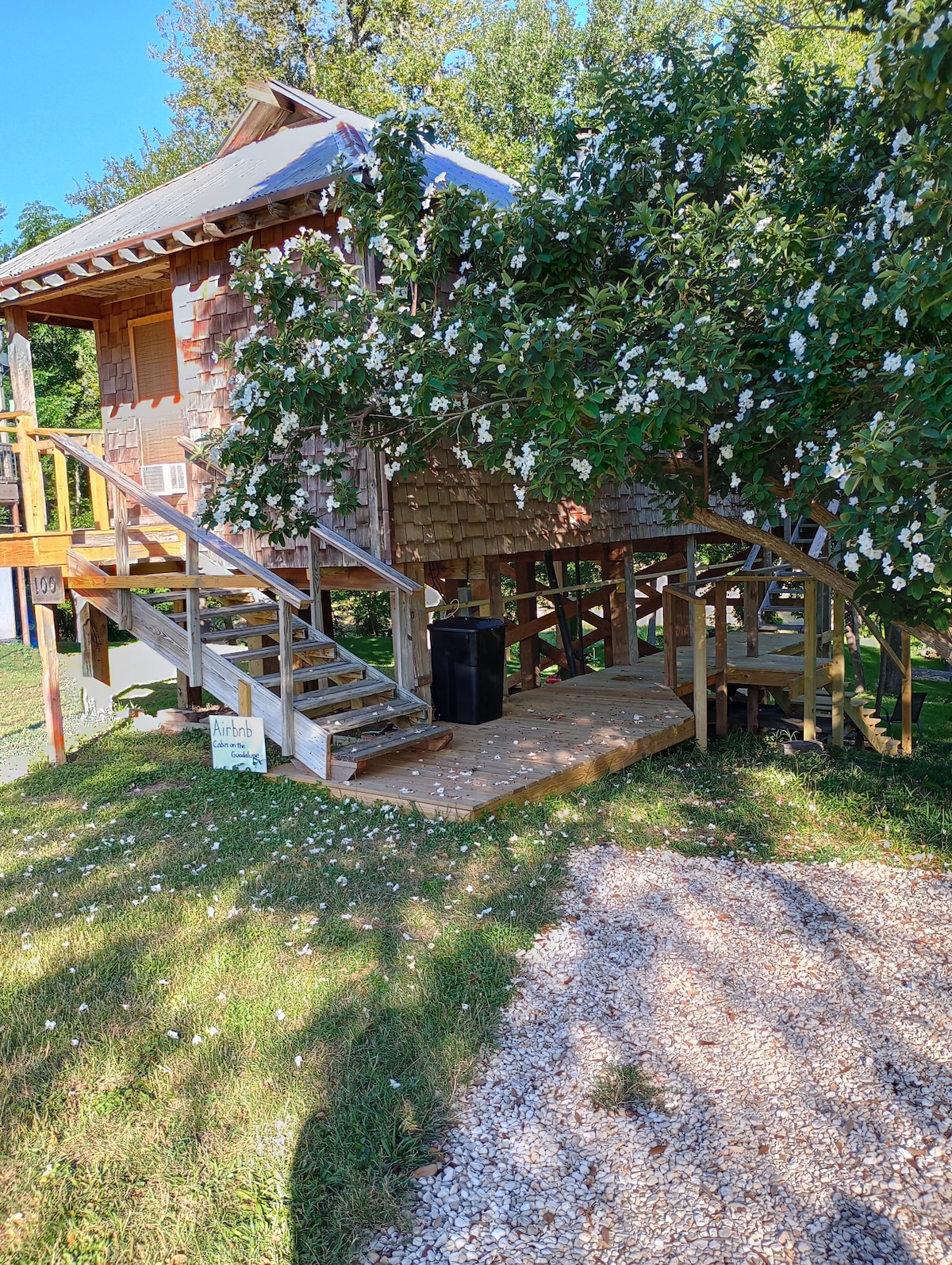 Come stay for a relaxing getaway! This cabin is only 100 feet away from the Guadalupe River, with a beautiful deck to watch the river and many birds among other wildlife. The cabin is hotel room sized, with one bathroom and a small kitchen in the corner. The cabin is elevated on stilts, so there are stairs at the entrance and off the back deck. Good access to river, with a small deck where you can launch a kayak or canoe. Bring your water shoes and fishing poles too!